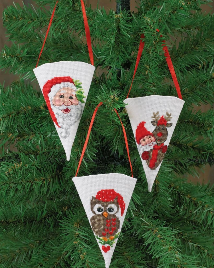 Nisser, ugle og Rudolf er et superfint lille julebroderi med 3 julede kræmmerhuse.