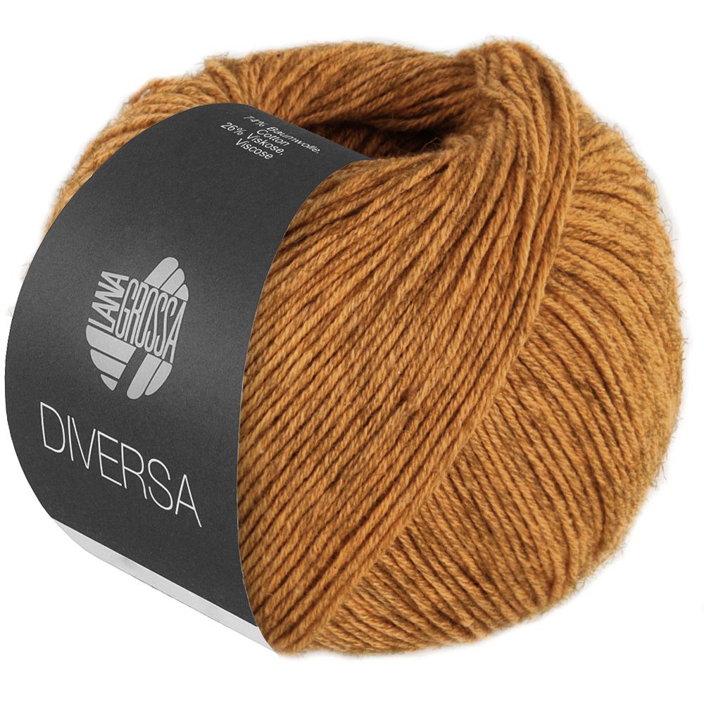 Garnet Diversa fra Lana Grossa er et let garn med god hold i. Til trods for, at størstedelen af garnet består af bomuld, føles garnet let og luftigt, det skyldes, at der er tilsat en lille smule viskose i Diversa. Da bomuld og viskose ikke modtager indfarvningen på samme måde, opstår der et smukt og let meleret garn, som passer til opskrifter, der har en strikkefasthed der hedder 24 masker på 10 cm på pind 3,5.