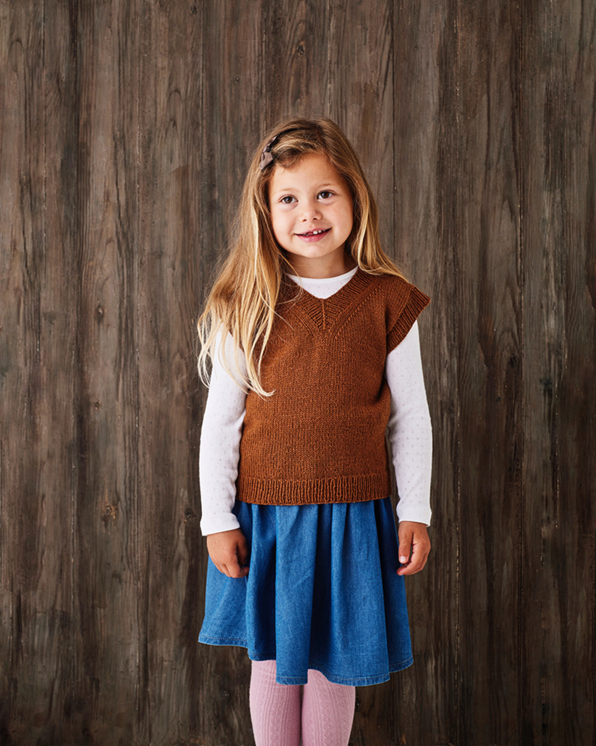 Glatstrikket vest til børn – Strikkeopskrift til en fin enkel vest, som kan bruges af både drenge og piger. Vesten strikkes nedefra og op med garnet Esther by Permin.