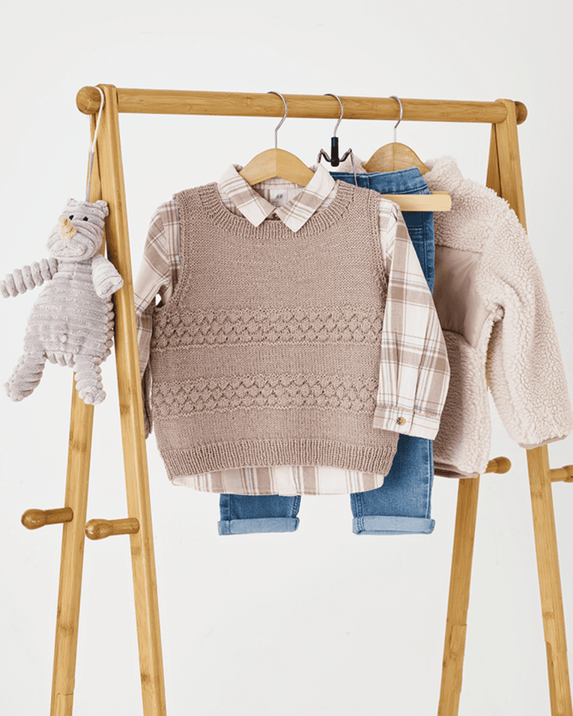 Strikkeopskrift til en vest med sømandsbobler til de mindste. Vesten strikkes frem og tilbage nedefra og op med sømandsbobler i striber. Sømandsboblerne bliver lidt bredere og kortere i strikkefastheden. Der skal strikkes med garnet Lillemor by Permin.
