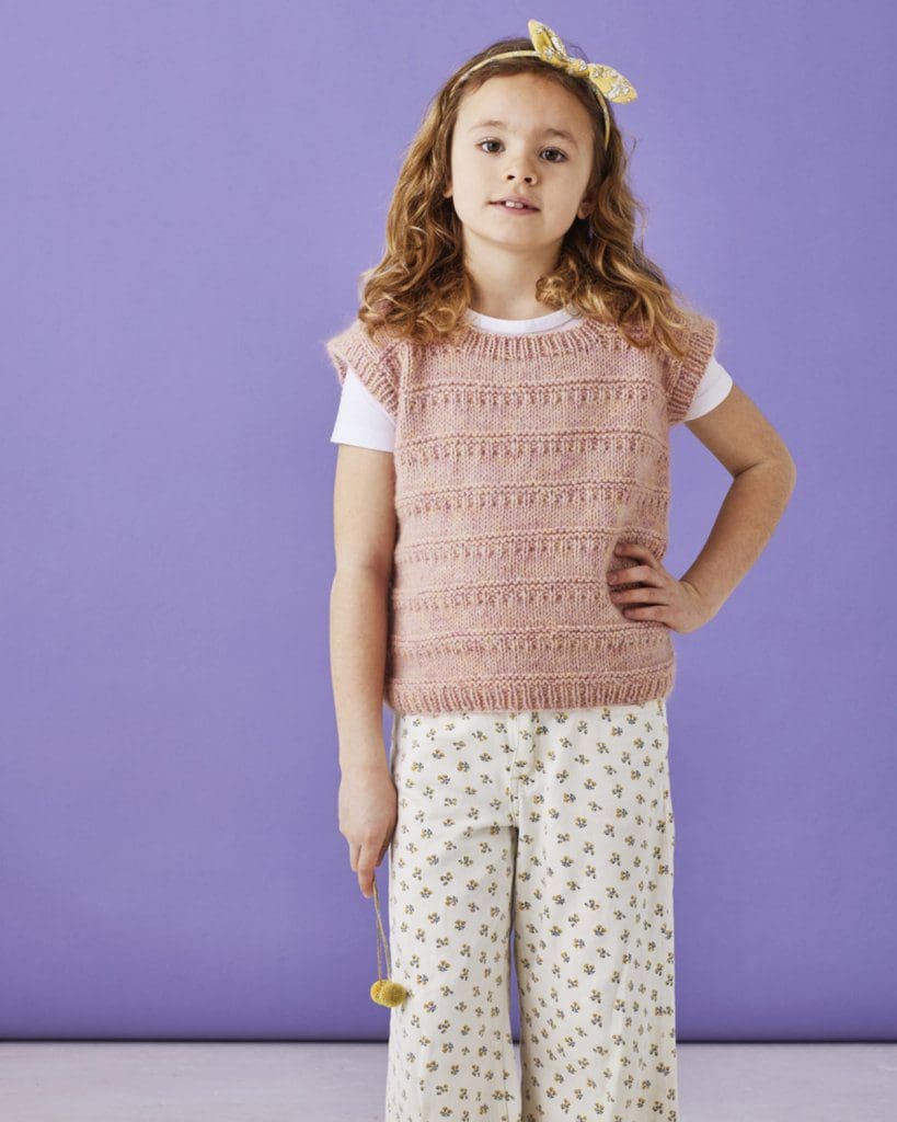 Strikkeopskrift til en vest med strukturstrik. Modellen strikkes i 1 tråd Luna og 1 tråd Angel Print, begge fra Permin, gennem hele arbejdet nedefra og op.