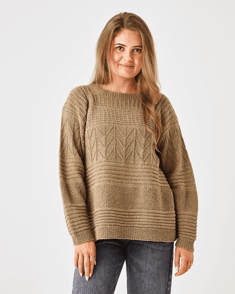 Strikkeopskrift til en flot trøje i strukturstrik. Der skal strikkes med garnet Esther by Permin, der er en blanding af uld og bomuld.