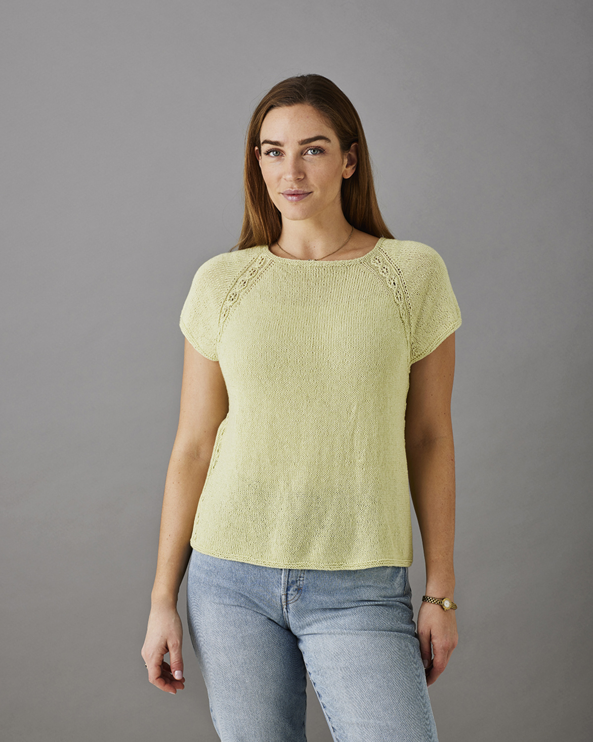 T-Shirt med hulsnoninger – Strikkeopskrift til en smuk enkel sommerbluse med gode detaljer ved raglanærmerne. Blusen strikkes oppefra og ned i glatstrik med garnet Elise by Permin. Garnet er et populært valg til strikning og hækling. Det er et blødt og lækkert og er velegnet til en bred vifte af projekter, lige fra tøj til tilbehør og hjemmeindretning. Elise kommer i forskellige farver og er kendt for sin gode kvalitet og holdbarhed.