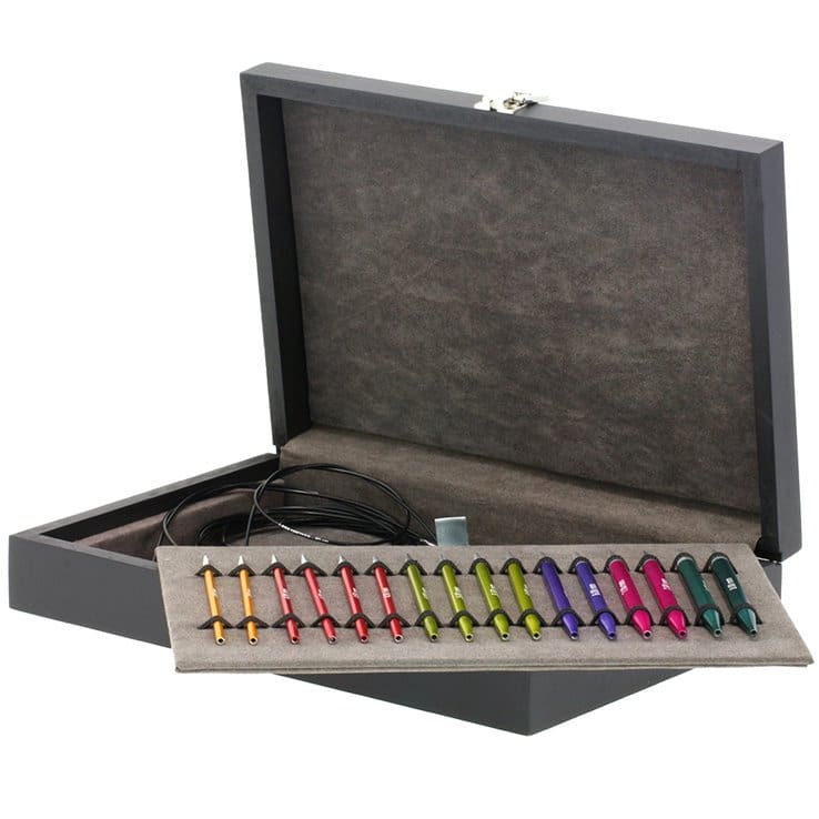 Sættet inkluderer et udvalg af rundpinde eller udskiftelige pinde i forskellige størrelser samt kabler i forskellige længder. Rainbowsættet er værdsat for sin overkommelige pris og alsidighed til forskellige typer strikkeprojekter. Faktisk er pindene de samme, som Zing, også fra KnitPro, men vores leverandør, kalder dem noget andet.