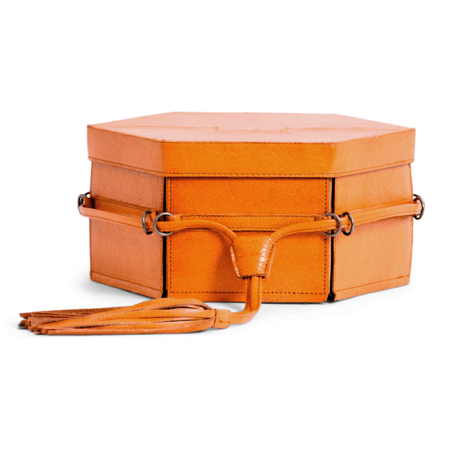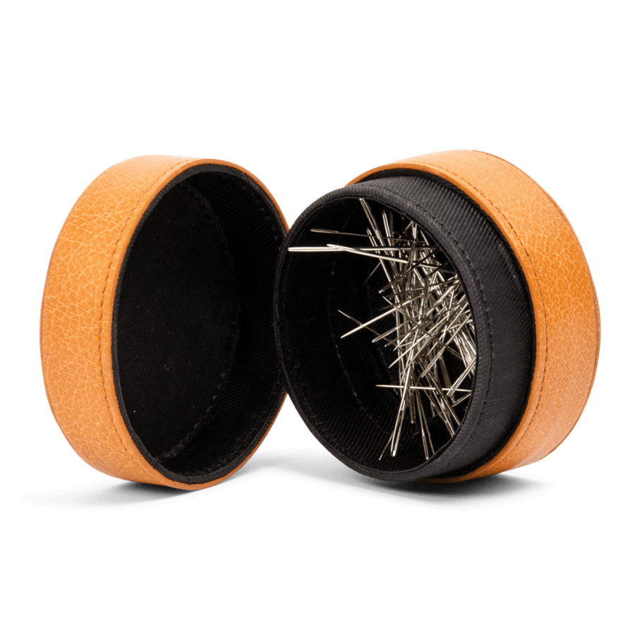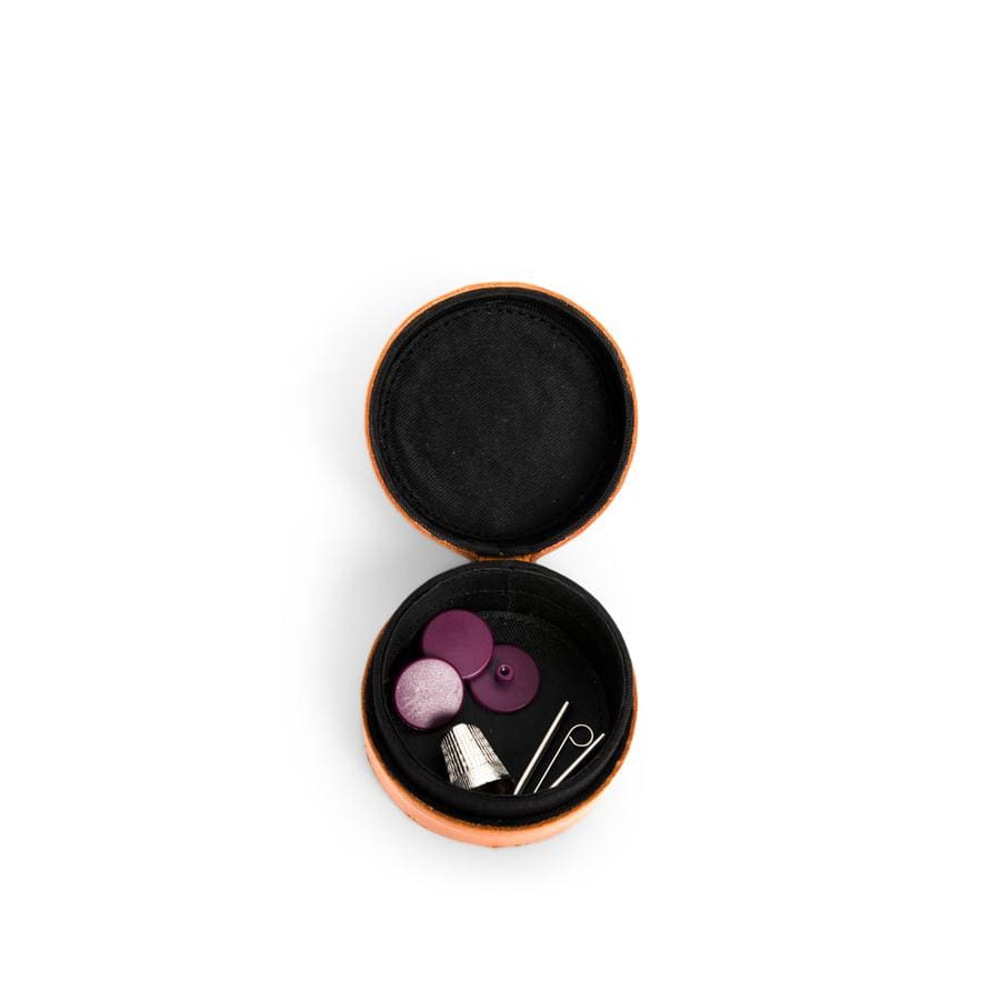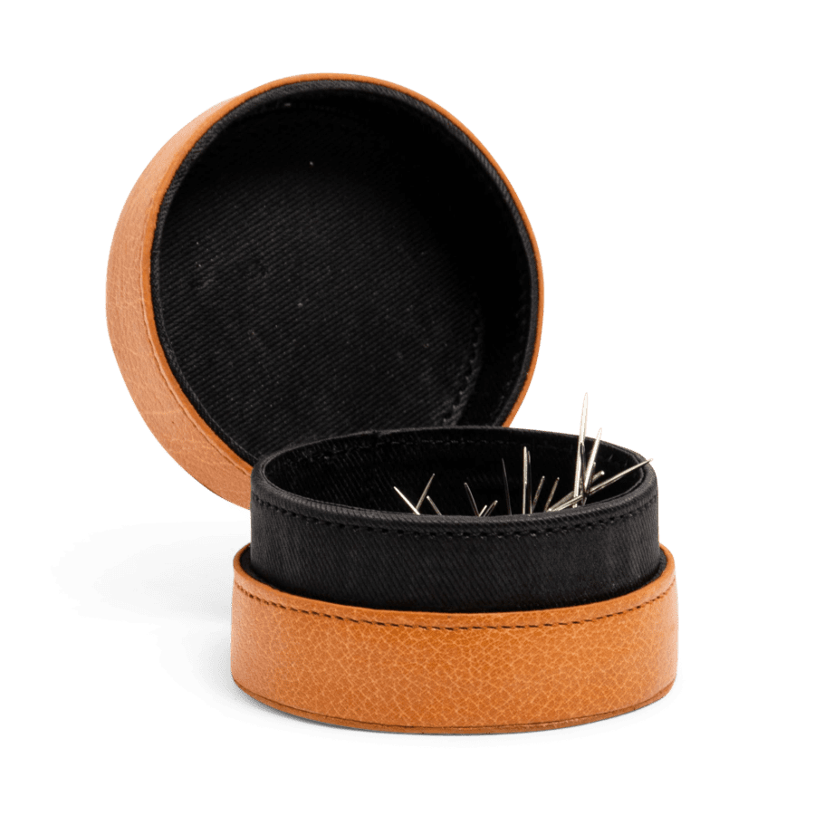 Når læderbåndet på boksen løsnes, foldes den sekskantede form ud. Brug de praktiske forlommer til at holde dine broderigarn, strikkepinde og tilbehør pænt organiseret.