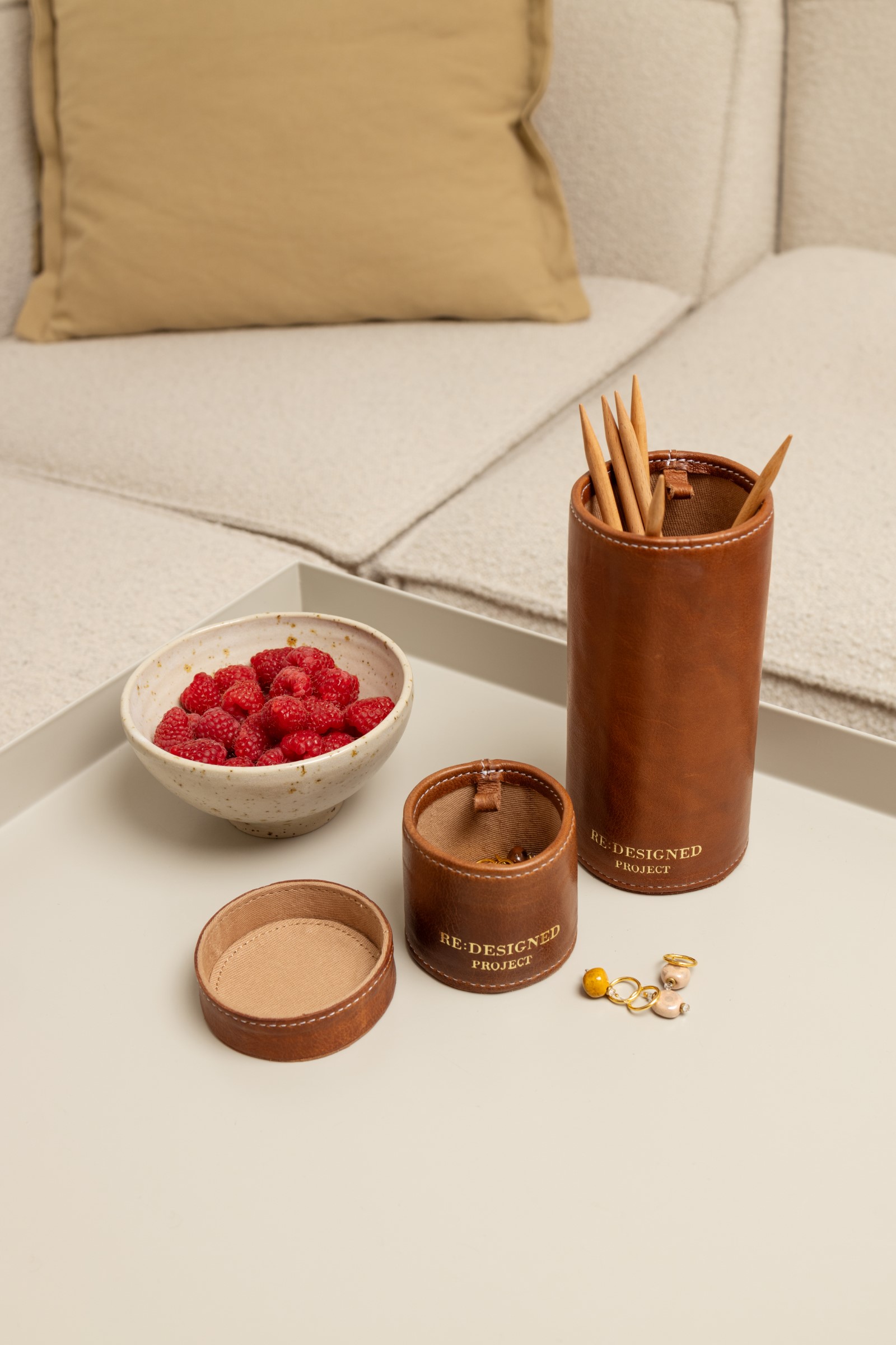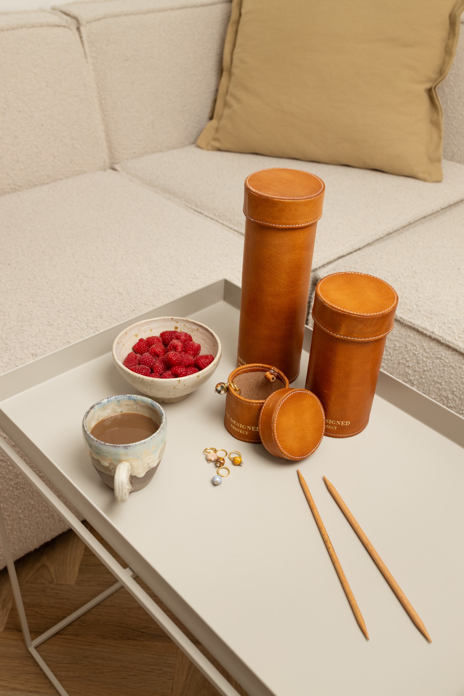 Project 49 er håndlavet i Re:Designeds karakteristiske Urban-læder – et smidigt og blødt okselæder med naturlig overfladestruktur og en let voksfinish. Hvert rør får dermed sit helt eget udtryk og patinerer smukt med tiden.